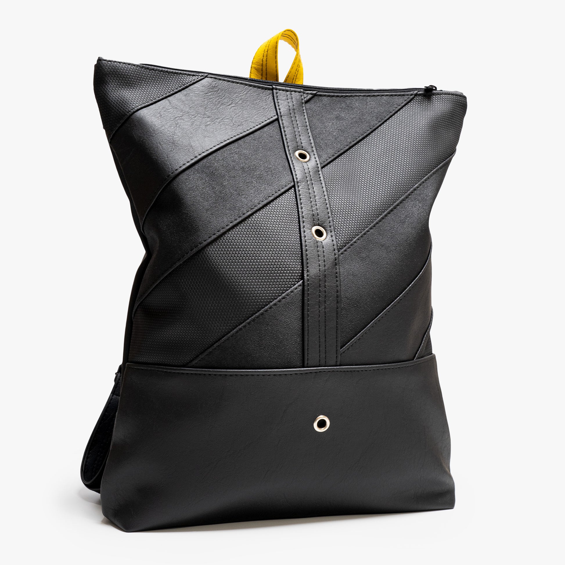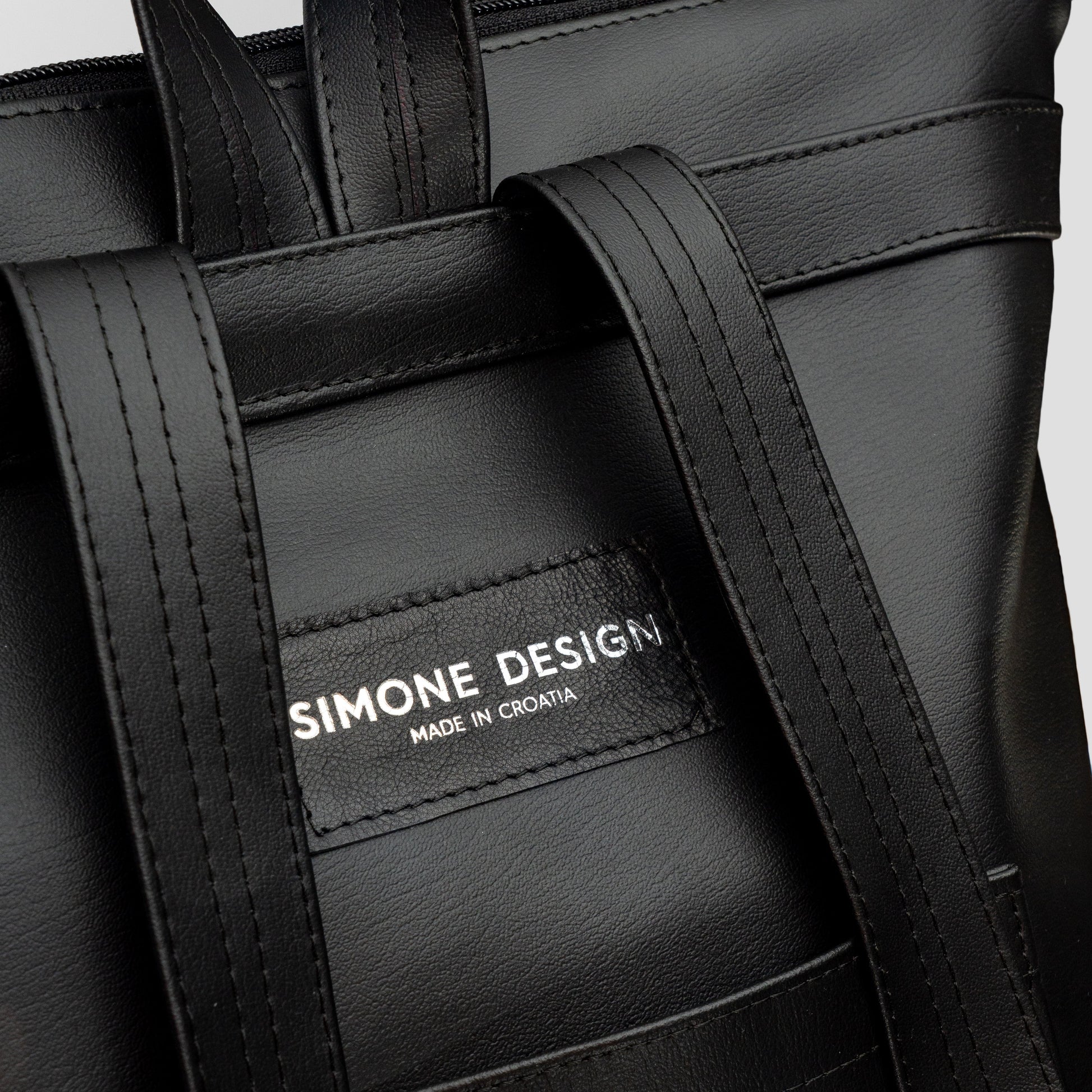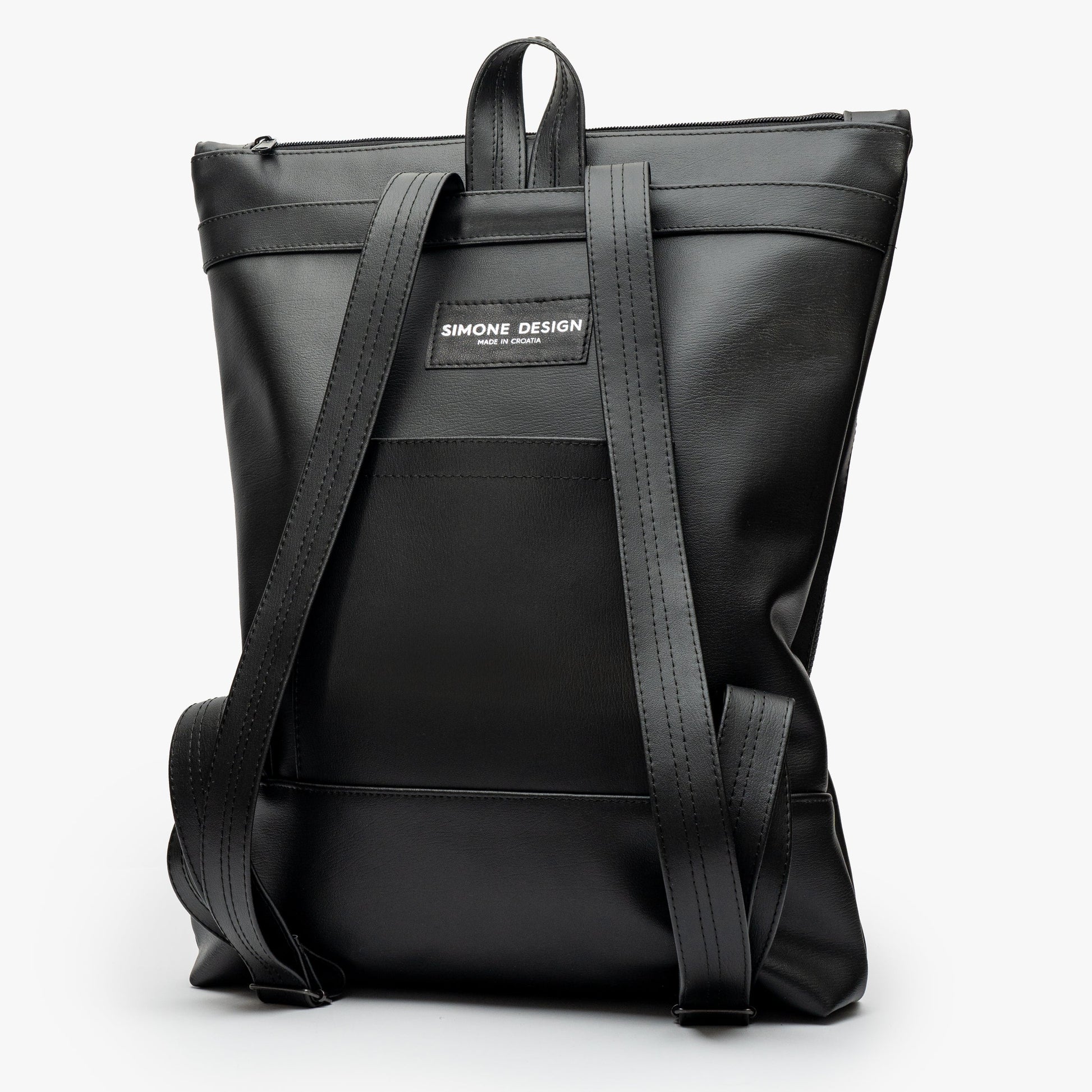 Ruksak je izrađen ručno od umjetne kože s kopčanjem na zatvarač, unutrašnjim i vanjskim našivenim džepom i regulatorima na oba remena.