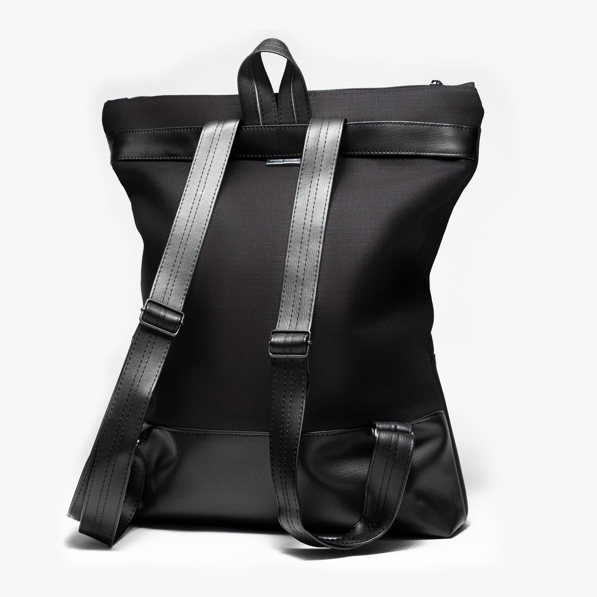 Ruksak je izrađen ručno od kombinacije umjetne kože i platna s kopčanjem na zatvarač, unutrašnjim našivenim džepom i regulatorima na oba remena.