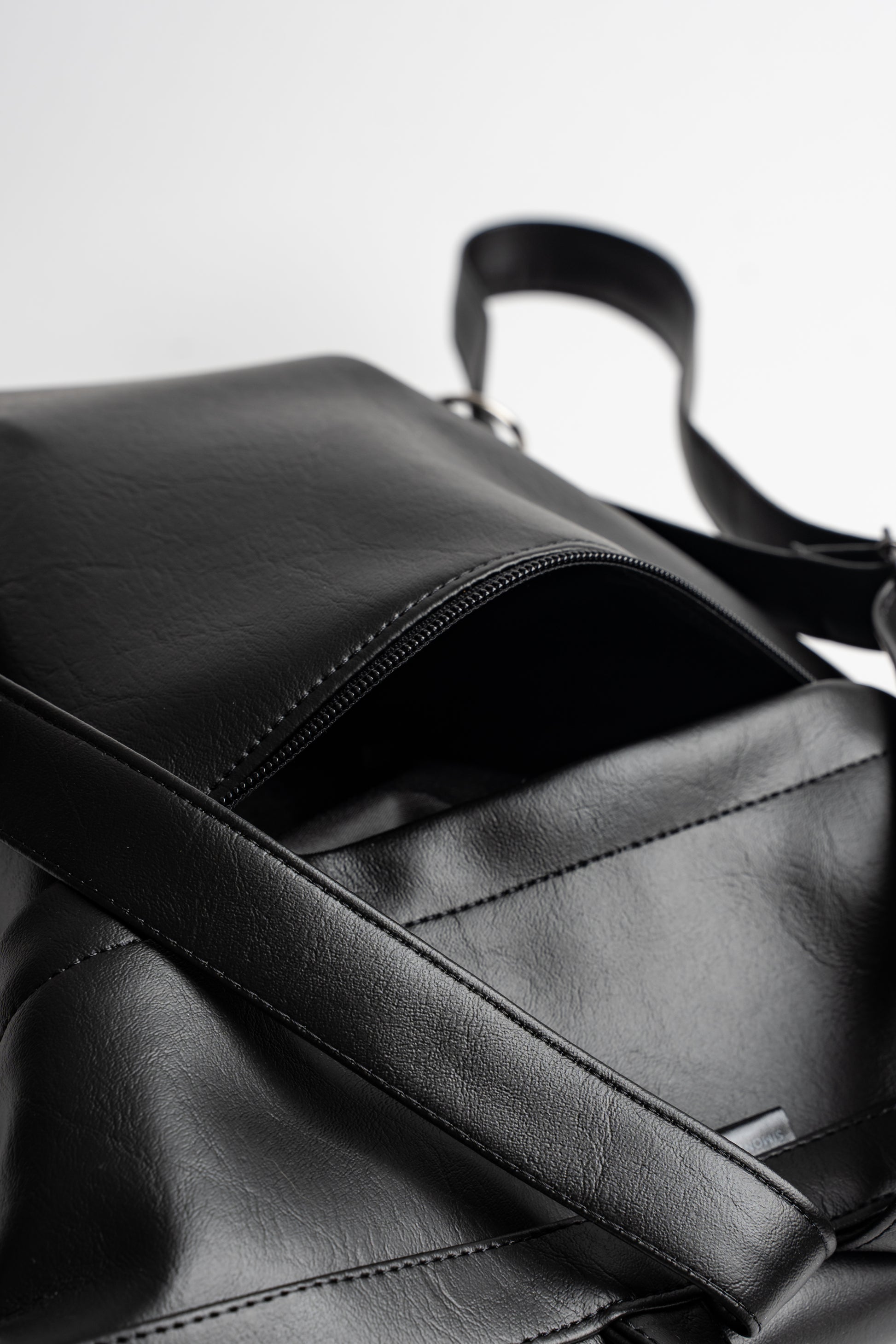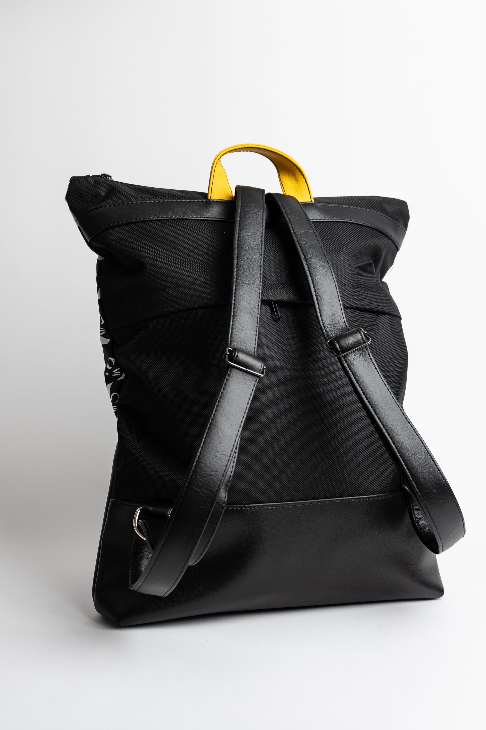 Ruksak je izrađen ručno od kombinacije umjetne kože i platna s kopčanjem na zatvarač, unutrašnjim našivenim džepom i regulatorima na oba remena.
