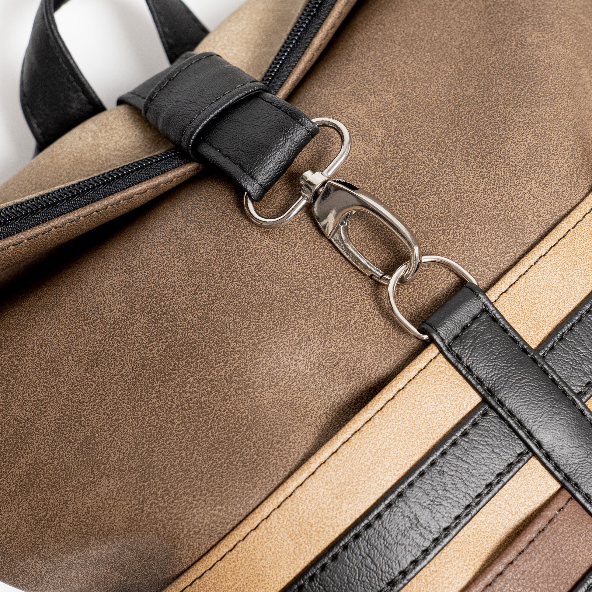 Ruksak je izrađen ručno od visokokvalitetne umjetne kože kopčanjem na zatvarač i pojasom s karabinerom. Velika i prostrana dva prednja i stražnja džepa te unutrašnji našivenim džep. Regulatori na oba remena.