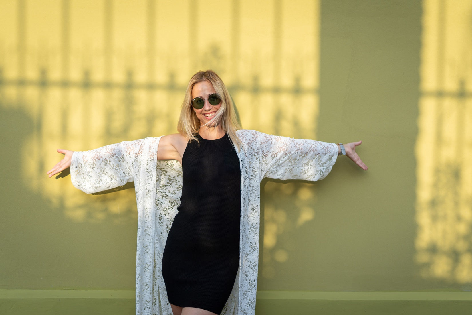 Ručno izrađeni lagani kimono napravljen od predivne viskozne bijele čipke, ugodne za nošenje. Remen koji se može vezati iza i naprijed. Savršen za sve odjevne kombinacije.
