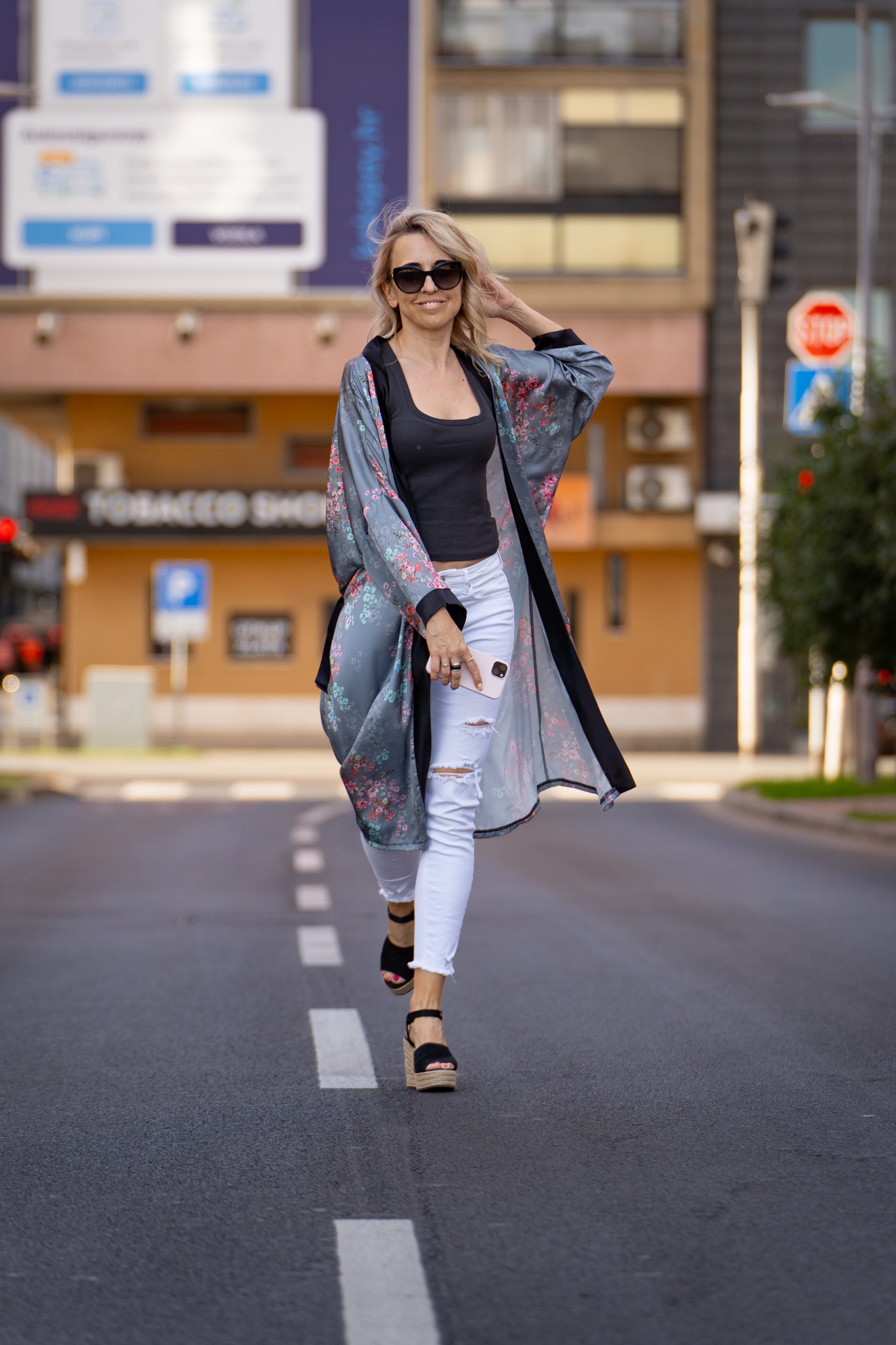 Ručno izrađeni lagani kimono napravljen od kombinacije viskoze i satena. Porubi kimona izrađeni su od satena, dok je glavni dio kimona izrađen od stopostotne viskoze. Vezanje oko struka satenskom trakom.