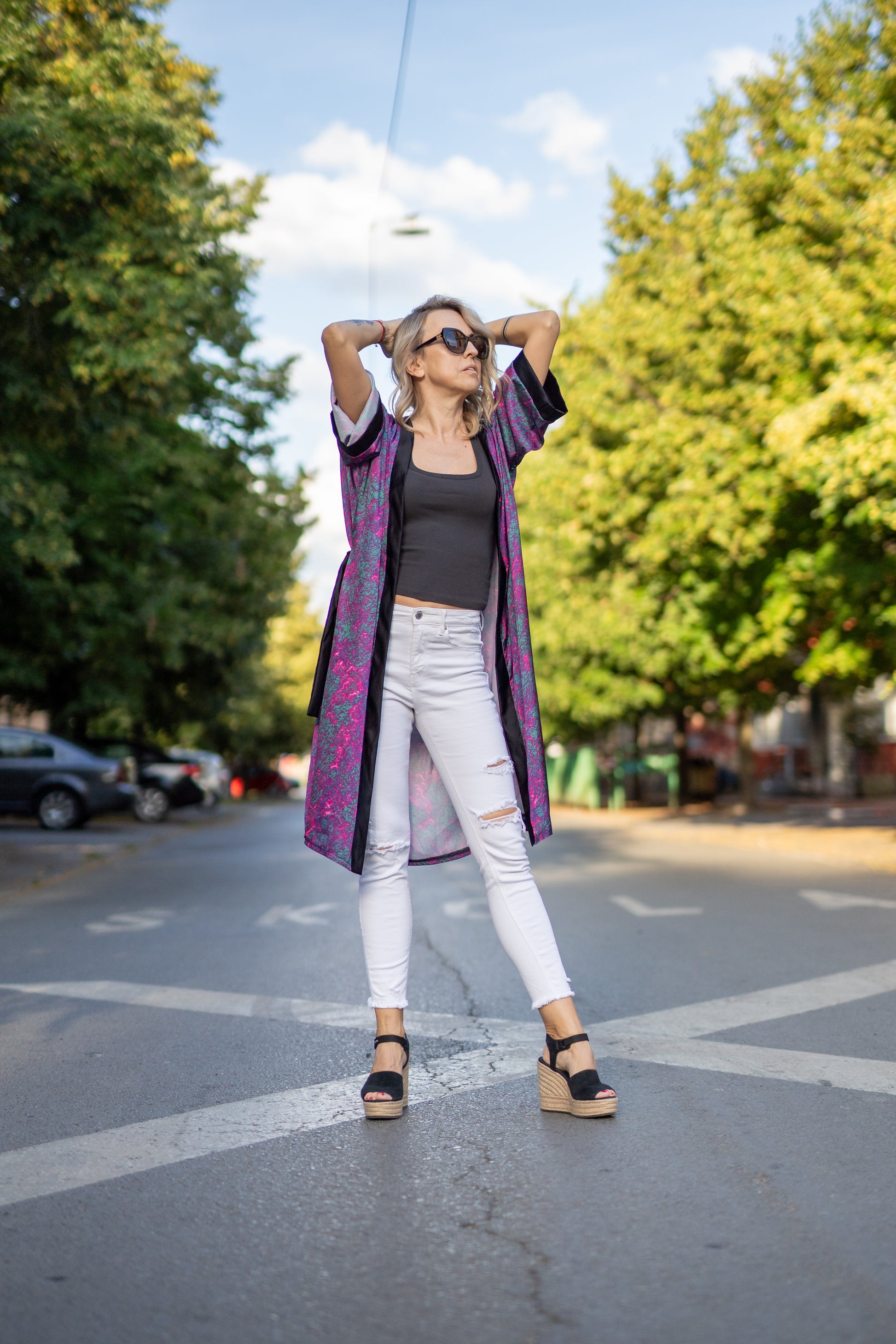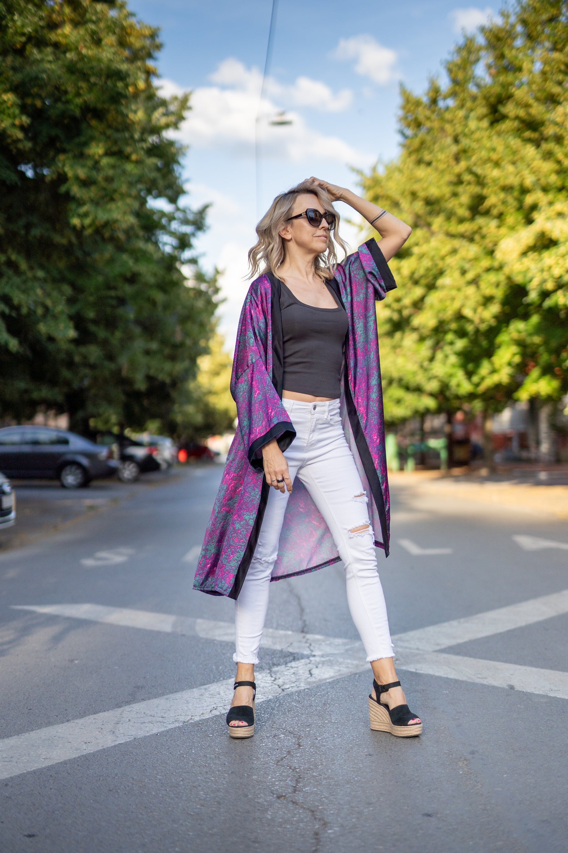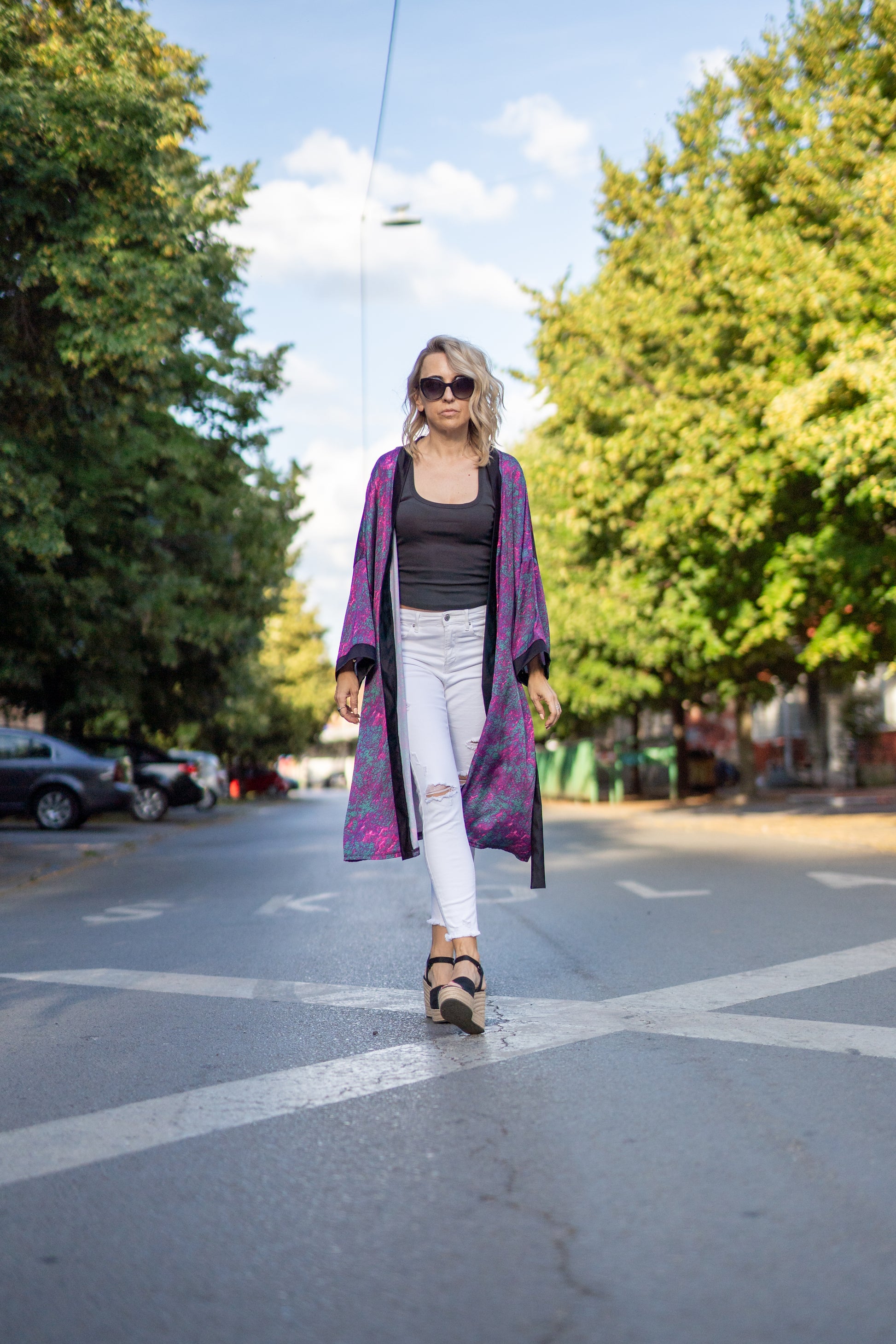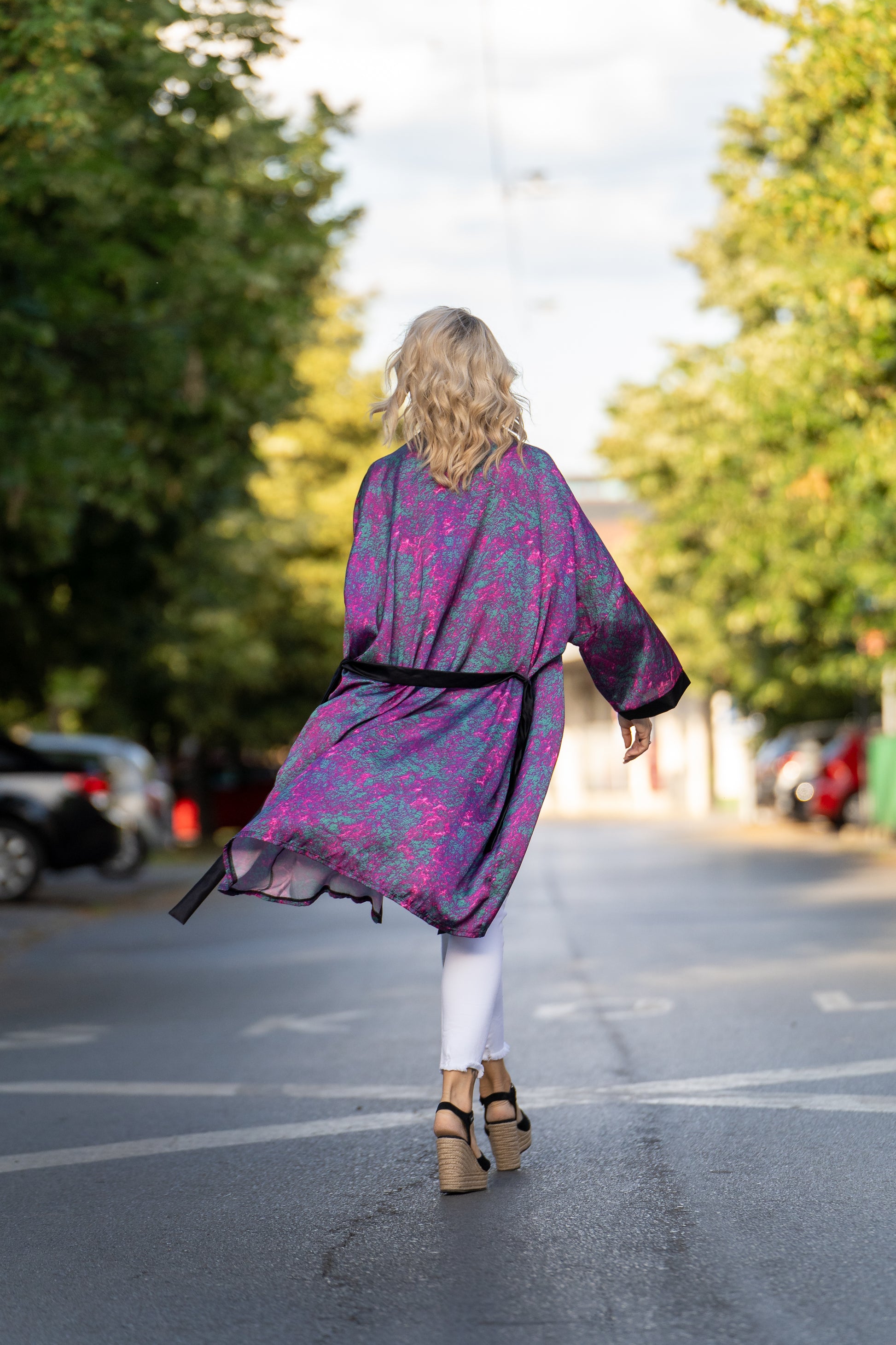Ručno izrađeni lagani kimono napravljen od kombinacije viskoze i satena. Porubi kimona izrađeni su od satena, dok je glavni dio kimona izrađen od stopostotne viskoze. Vezanje oko struka satenskom trakom.
