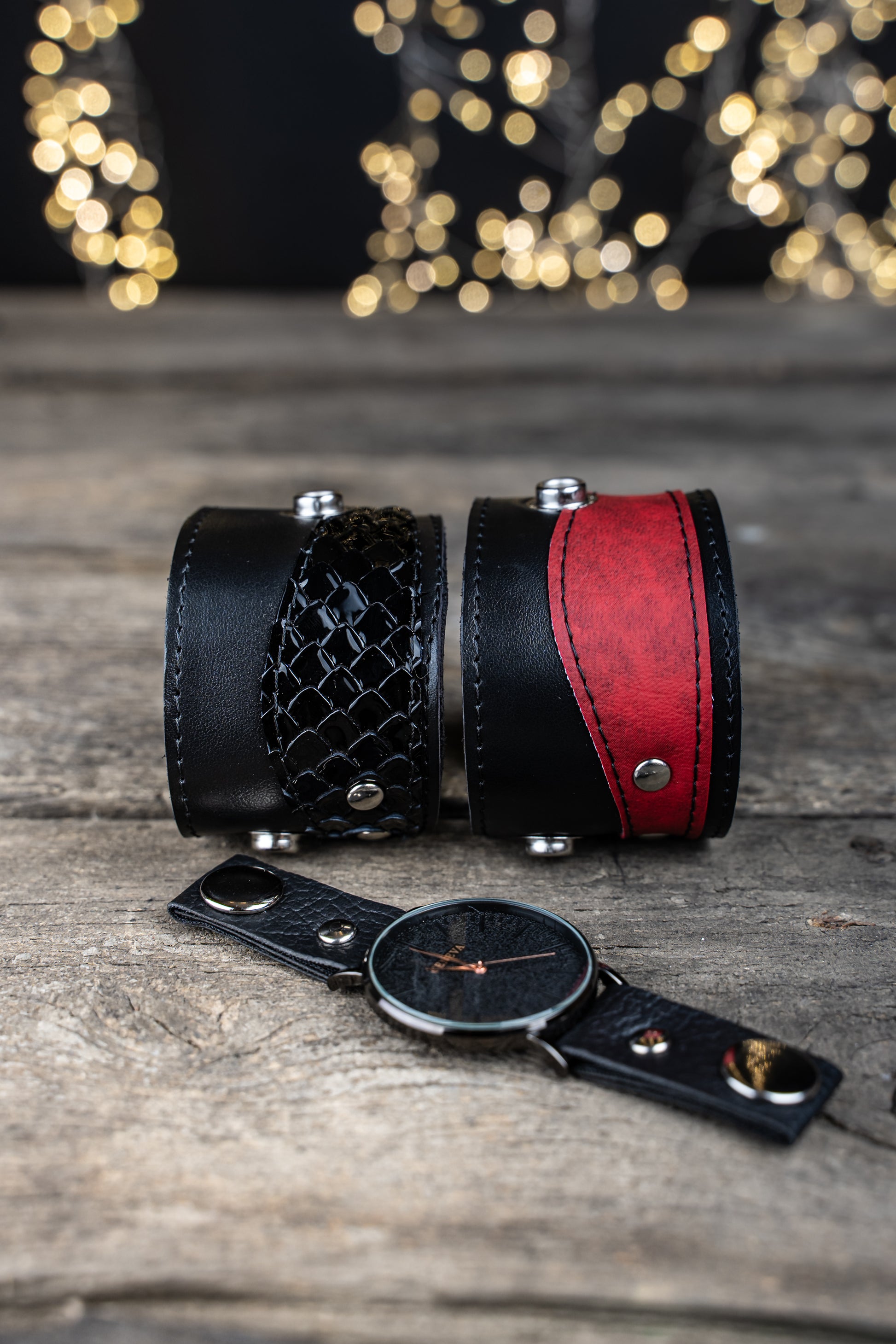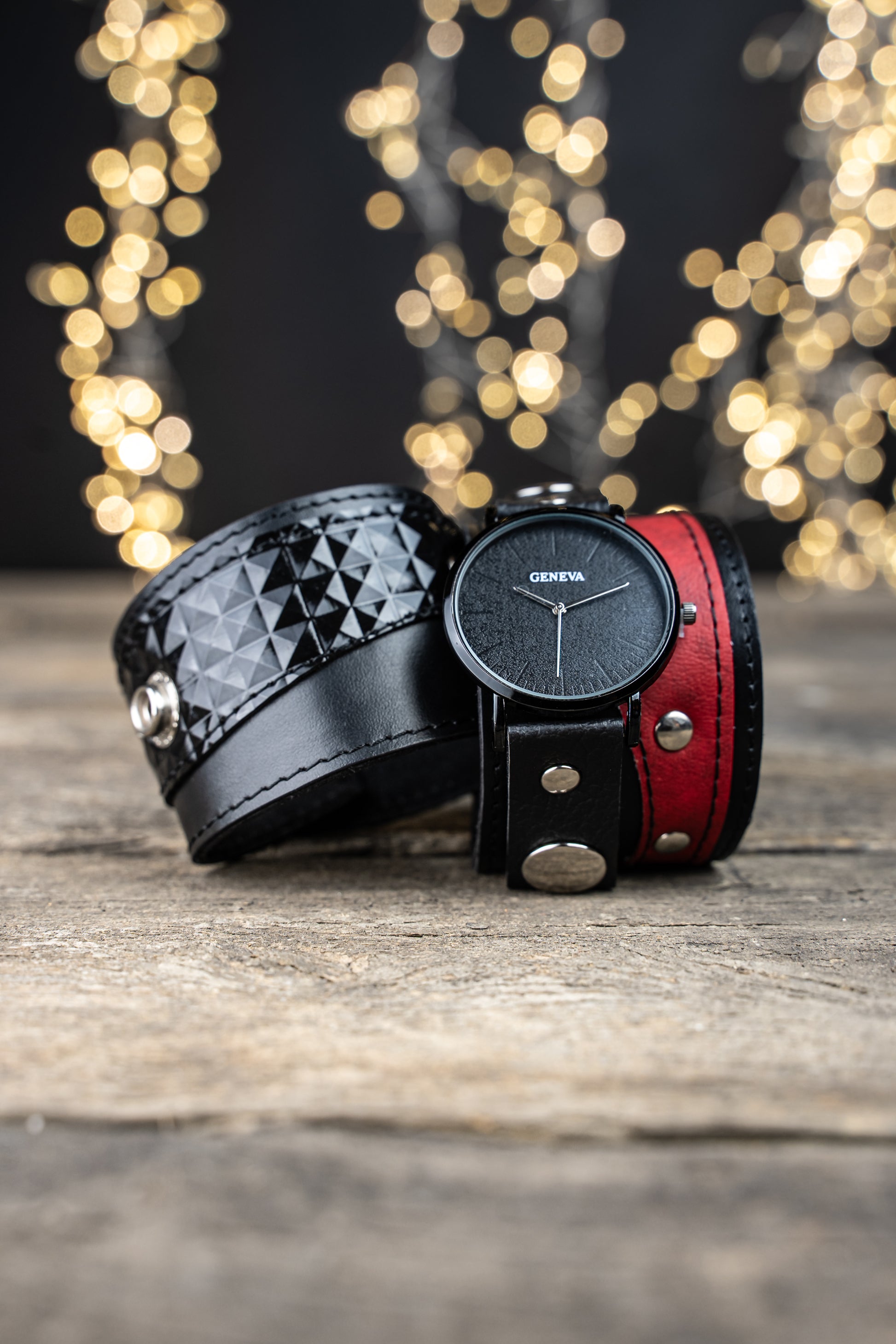 Ručno izrađena narukvica s dodatkom sata na kvarcni mehanizam koji se može skinuti i staviti na drugu narukvicu. Izrađena od kombinacije prave i umjetne visokokvalitetne kože. Klasičan način duplog kopčanja na druker. Veće dimenzije kopčanja posebno naglasiti u emailu.