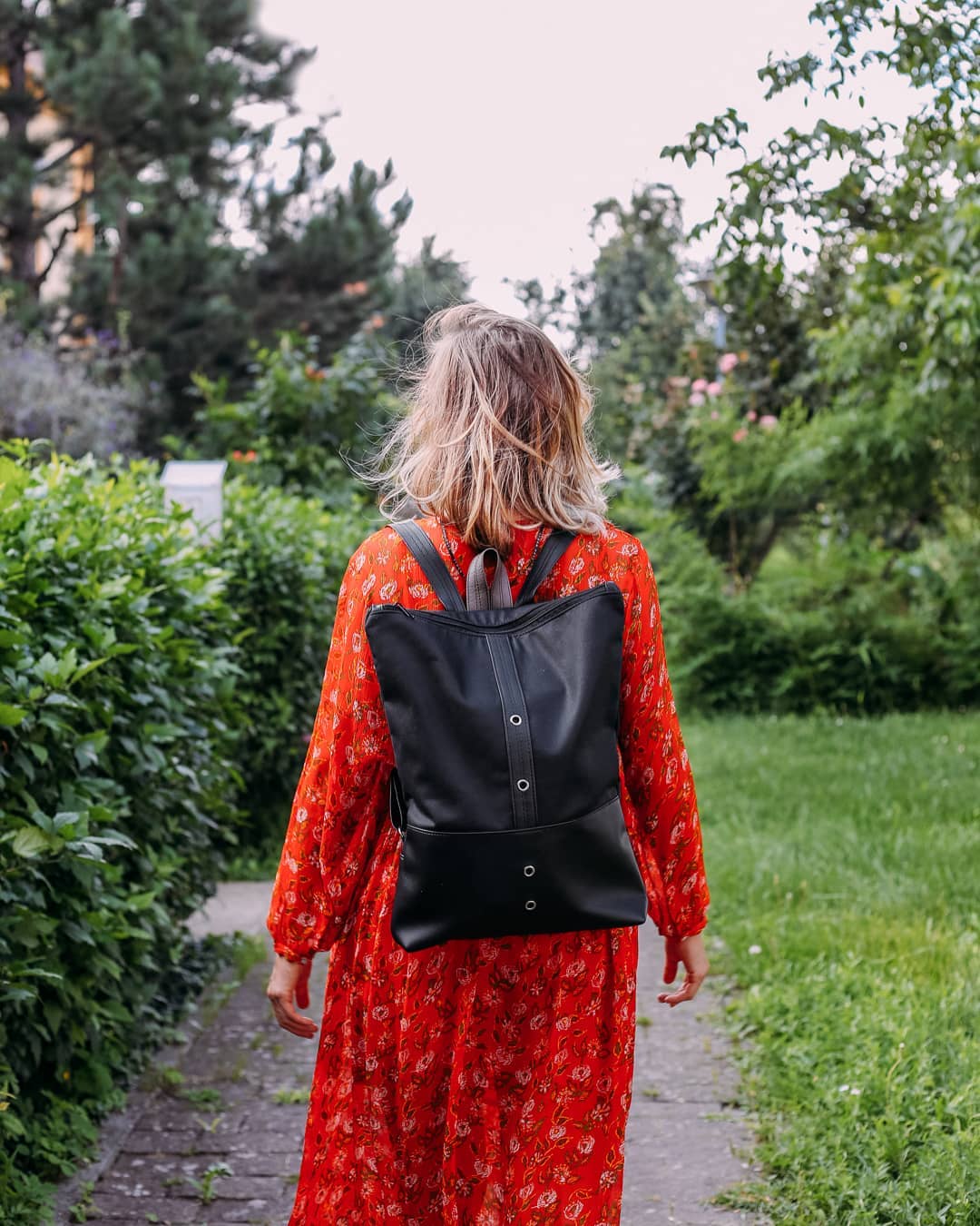 Ruksak je izrađen ručno od kombinacije umjetne kože i platna s kopčanjem na zatvarač, unutrašnjim našivenim džepom i regulatorima na oba remena.